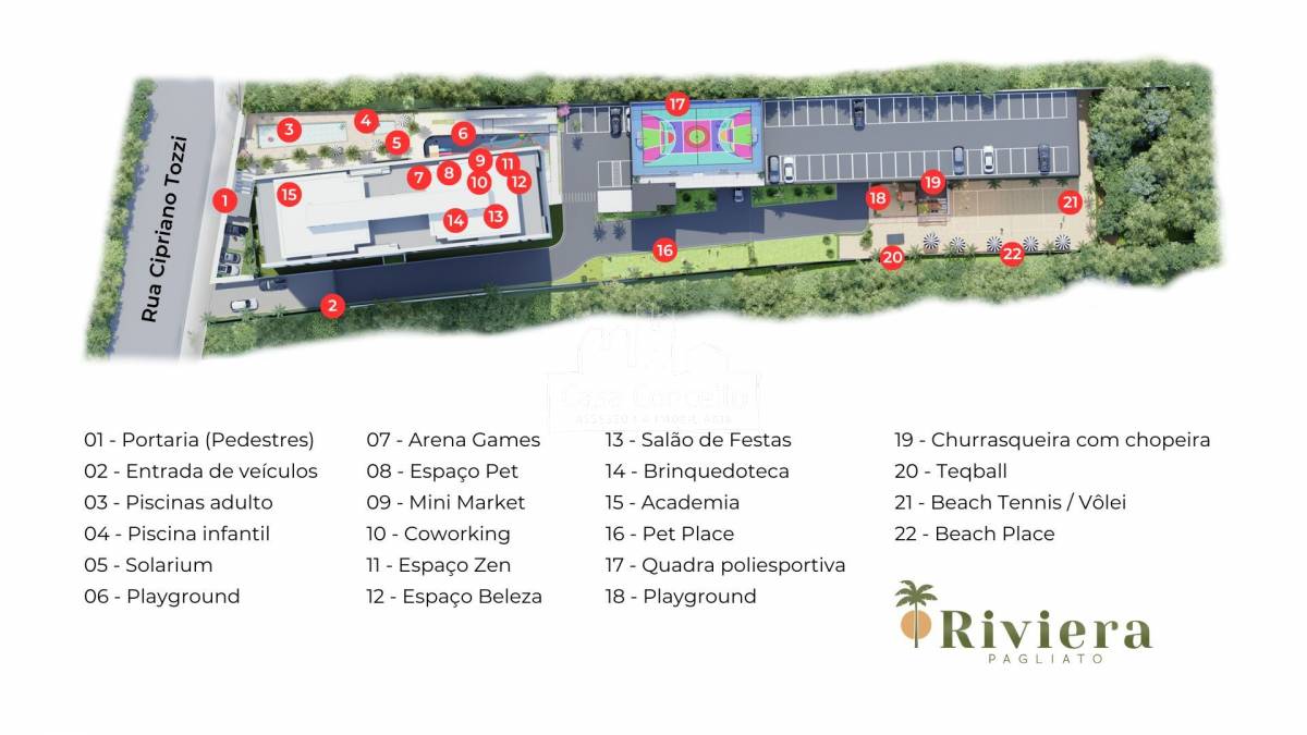 Com mais de 400 unidades entregues em Sorocaba e São Paulo, a construtora Verônica é referência em qualidade de construção e padrão de acabamentos. Nós valorizamos a qualidade de vida de nossos clientes! CLUBE PRIVATIVO 01 - Portaria (Pedestres) 02 - Entrada de veículos 03 - Piscinas adulto 04 - Piscina infantil 05 - Solarium 06 - Playground 07 - Arena Games 08 - Espaço Pet 09 - Mini Market 10 - Coworking 11 - Espaço Zen 12 - Espaço Beleza 13 - Salão de Festas 14 - Brinquedoteca 15 - Academia 16 - Pet Place 17 - Quadra poliesportiva 18 - Playground 19 - Churrasqueira com chopeira 20 - Teqball 21 - Beach Tennis / Vôlei 22 - Beach Place