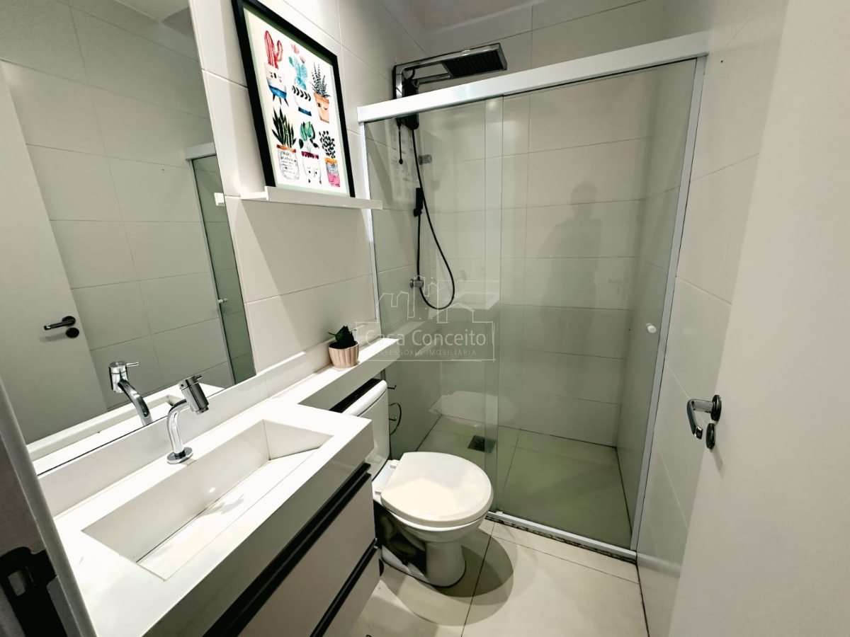 2 suítes, ambas com grandes guarda-roupas embutidos. Sendo 1 com varanda e os banheiros completos com armários sob a pia, box de vidro.