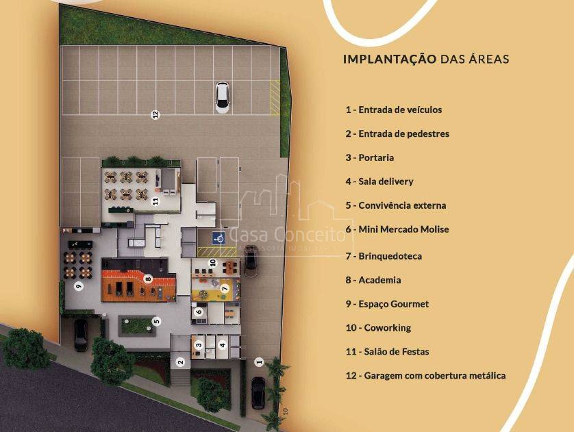 - Salão de festas - Academia - Espaço Gourmet - Bicicletario - Brinquedoteca - Coworking - Mini Market - Sala Delivery - Praça Convivencia - Living