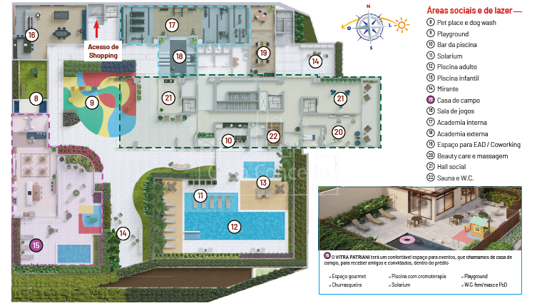 O Bosque Iguatemi não é apenas um espaço verde, mas uma verdadeira extensão da sofisticação do Vitra, com áreas pensadas para o bem-estar de toda a família, incluindo parques para pets, academia, bancos confortáveis, cafés e lanchonetes para momentos de lazer. A modernidade do projeto também se reflete na presença de uma escada rolante e em outras comodidades que tornam o ambiente ainda mais agradável e funcional.