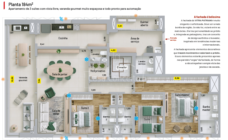 A segurança, como não poderia deixar de ser, é um aspecto fundamental do Vitra Patriani. Com acessos privativos e monitoramento contínuo, os moradores podem desfrutar de toda a tranquilidade necessária para viver com total conforto e paz de espírito. O design e a infraestrutura do Vitra oferecem um ambiente que combina elegância, conforto e praticidade, proporcionando uma nova forma de viver em alto padrão.