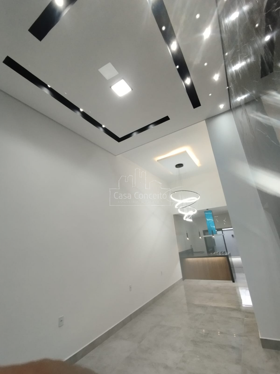 A sala de estar possui pé direito alto, sanca de LED e painel de TV em porcelanato, trazendo elegância e sofisticação ao ambiente. A sala de jantar complementa o espaço social, perfeito para receber convidados.